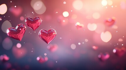Three shiny red hearts float in a vibrant pink and purple background with bokeh lights and small hearts. Valentine day Special