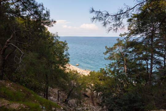 A rocky path adown to the sea through the grove