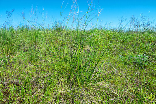 Vegetated dune. Valley of the Don River, spring temperate grassland, fescue-forb steppe. Feather-grass (Stipa sp.) beginning of flowering. Southern Russia