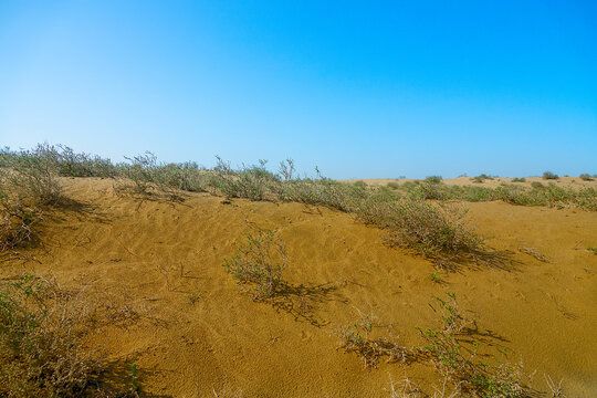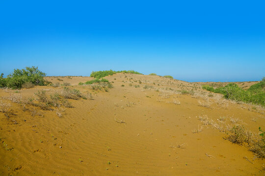 Types of landscape. Barchan dune. A seaside desert with thorny shrubs. Oman