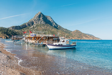 Tourist boats in the sea. View on Adrasan Bay. Aged photo. Pine trees and sea. Toned image. Walking the Turkey's Lycian Way. Antalya Province, Turkey. Wide format for a slider.