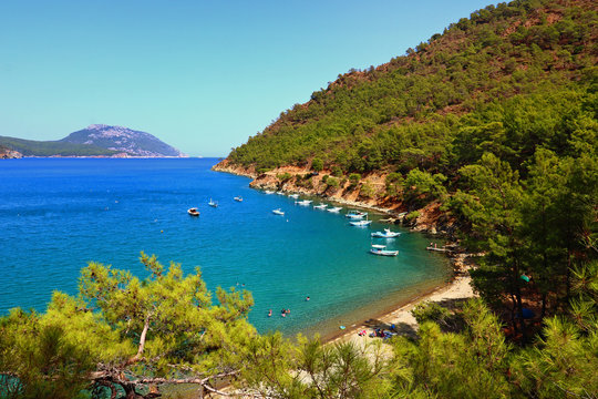 The Scenic view of  Bay of Adrasan from the Adrasan Castle, naturally protected area, surrounded by a national park with pine forests, Taurus Mountains, blue water lagoons and sandy beaches.