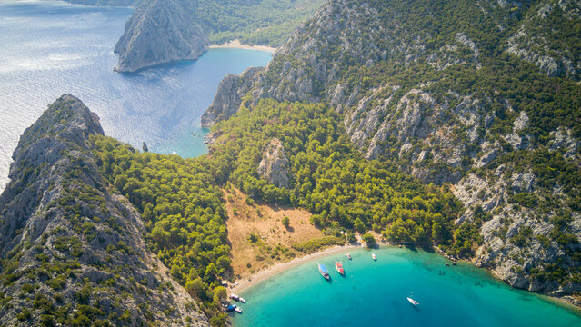 Panoramic view of Pirate bay or Korsan Koyu near Karaoz, Antalya. Summer and Holiday background.