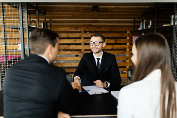 Sell concept. Young couple greetings with manager in office.