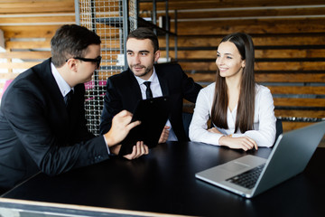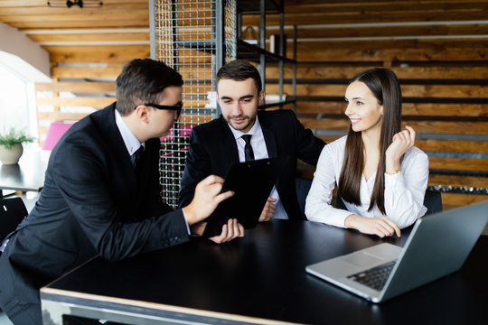 Tradel concept. Team lisning the details of contract in office.
