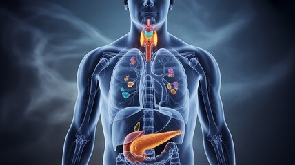 Detailed 3d illustration of a human kidney cross section showcasing a tumor on the adrenal gland with internal structures and blood vessels against a blurred blue background