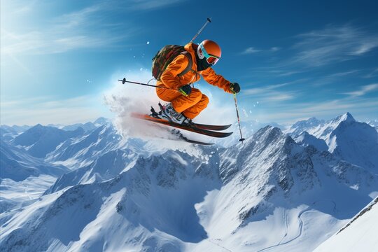 Skilled Skier Performing Mid-Air Jump with Powder Snow Swirling on Clear Day Mountainside