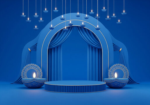 Blue stage setup featuring a large arched curtain illuminated by warm deepavali lighting. The backdrop consists of flowing blue fabric and hanging diwali diya decorations.