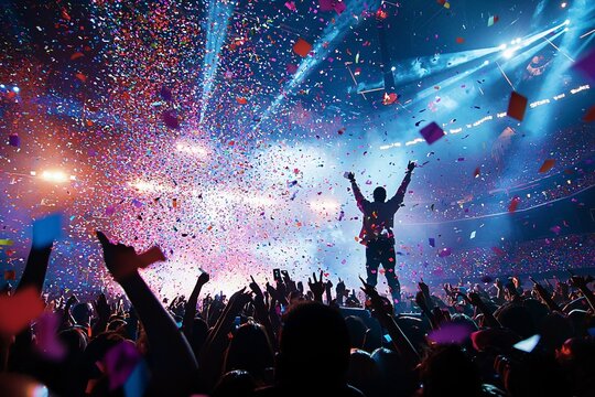 A sea of ecstatic fans cheers wildly as an artist steps into the spotlight, surrounded by dazzling lights and cascading confetti.