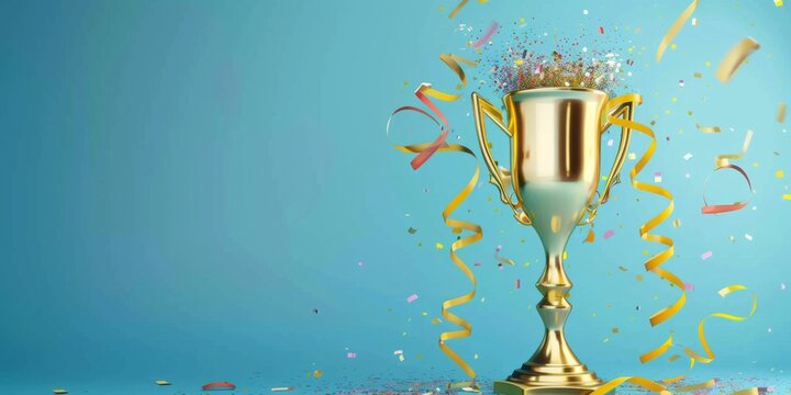 Golden Trophy With Confetti And Ribbons On Blue Background