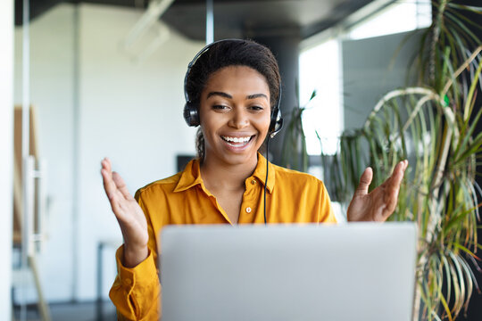 Female employee talk on team video call with colleagues coworkers. Business woman has webcam digital virtual conference at home office, speak in online group meeting.