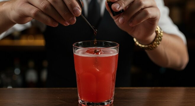 Close-up of bartender hand secretly adding substance to drink, concept of drink tampering and danger