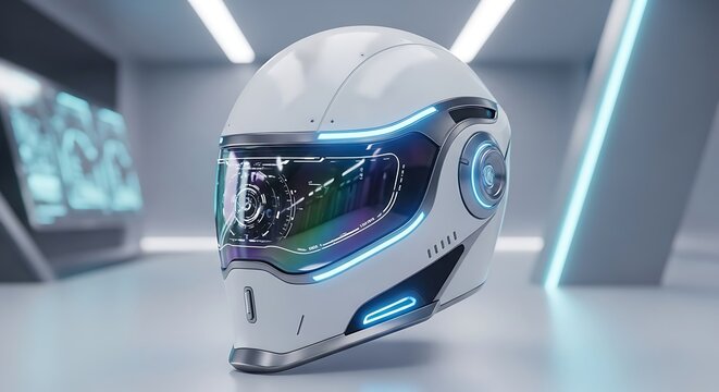 Sleek, futuristic helmet showcases advanced technology in a modern setting.  A high-tech visor displays complex holographic data, illuminated by vibrant blue accents.