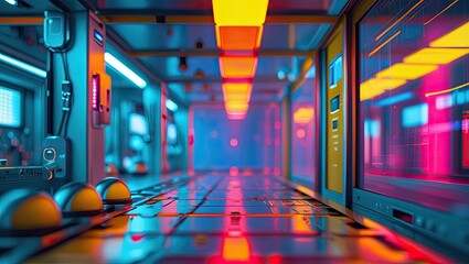 Futuristic corridor with vibrant neon lighting and advanced technology.