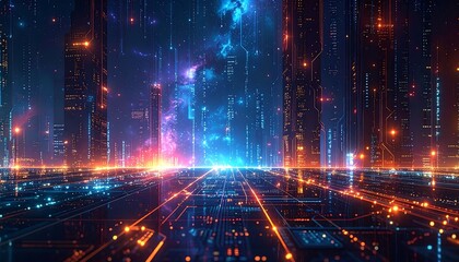 A futuristic cityscape, bathed in vibrant neon lights and glowing digital pathways, creates a captivating and technologically advanced scene.
