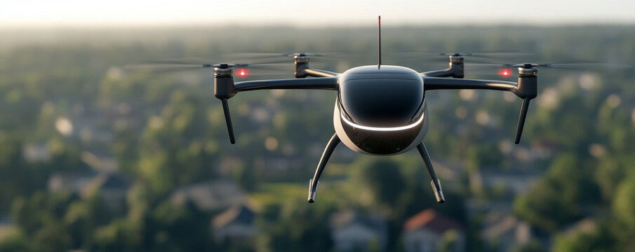 Electric vertical takeoff and landing aircraft hovering near suburban houses, representing advanced urban transportation technology and innovation