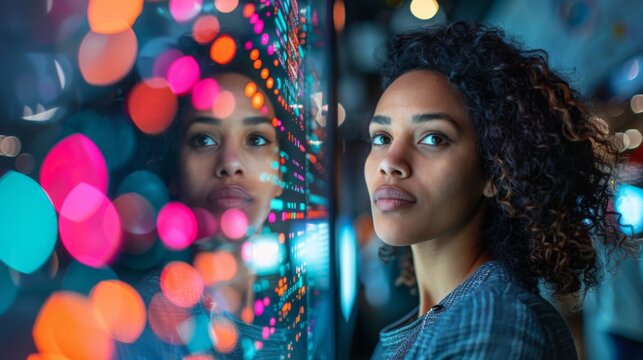 person interacting with a futuristic, digital interface with glowing screens and transparent elements, indicative of advanced data analysis or technology.