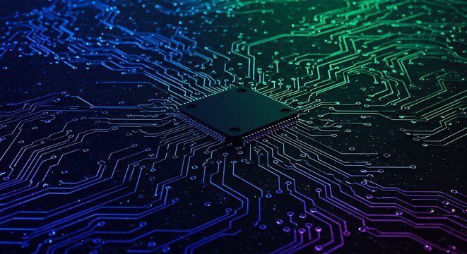 Powerful central processor unit on a futuristic circuit board with glowing neon data pathways representing advanced technology.