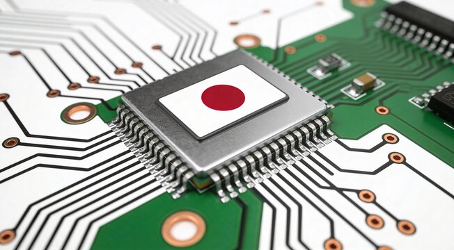 Japanese Flag Overlay on Computer Processor, Future Technology and Hardware Concept