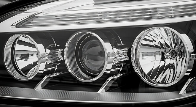 Close-up view of a car's headlights showcasing sleek design and modern technology in a monochrome setting