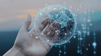 Fingertip interacts with a glowing, networked digital sphere