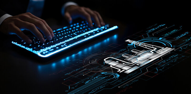 Futuristic keyboard input with holographic display, depicting advanced technology and data visualization concept in dark environment for innovation themes