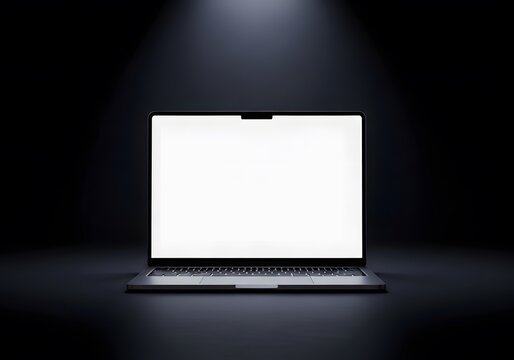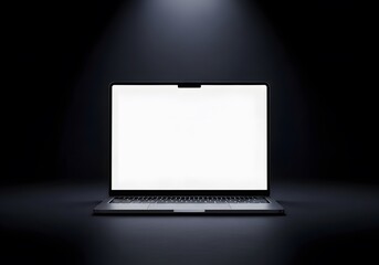 Modern laptop computer displaying a blank white screen in a dark studio environment with spotlight illumination