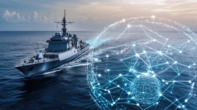 A contemporary naval vessel moves through tranquil seas amidst digital connections highlighting technological advancements in maritime warfare