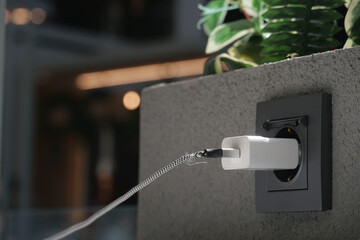 Puts wires of tablet advanced electronic equipment, phone charger in a convenient storage bag. Preparing for a business trip or vacation. Packing method for technological tools.