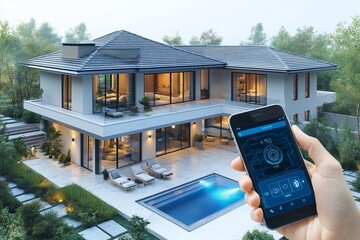 Luxurious modern smart home featuring a swimming pool, controlled via a smartphone app for convenient automation and comfort.