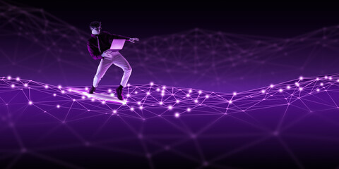 Man balancing on digital network waves, holding laptop, navigating futuristic data landscape with glowing purple connections. Concept of digital business, technology, innovation, cybersecurity