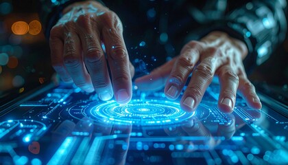 Human Hands Interacting with Futuristic Glowing Blue Digital Touchscreen Interface, Symbolizing AI, Big Data, and Advanced Network Connectivity in a High-Tech Concept