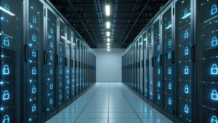 Cybersecurity concept in data center environment with digital padlock icon