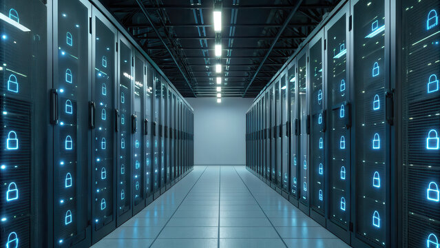 Cybersecurity concept with digital lock overlay on servers