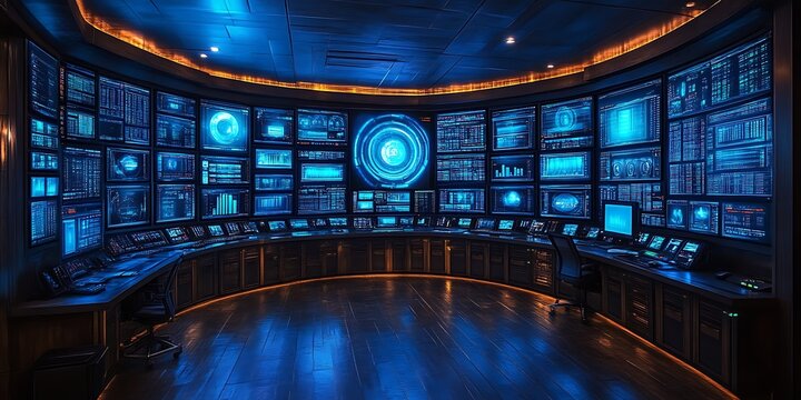 Futuristic Control Room with Multiple Screens Displaying Data and Information