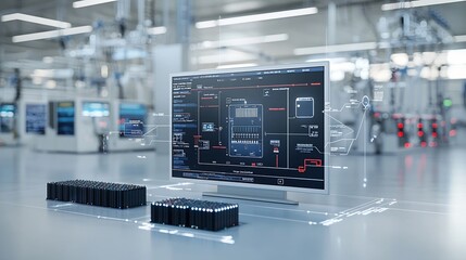 Warehouse management control room with advanced digital interfaces and data analytics displays in a modern laboratory setting.