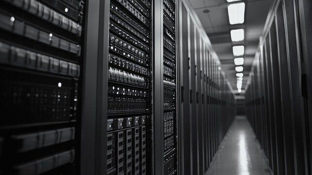 Rows of modern server racks illuminated in a high-tech data center showcasing advanced technology and infrastructure for data management