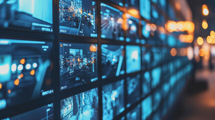 Advanced digital surveillance technology concept showcasing multiple monitoring screens displaying urban environments and real-time data feeds in a modern control room setting.