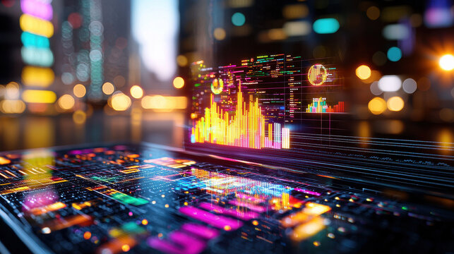 Digital graphs and data charts overlay on urban nightscape