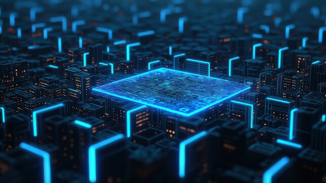 A futuristic digital cityscape featuring glowing blue grids and buildings, representing advanced technology and connectivity.