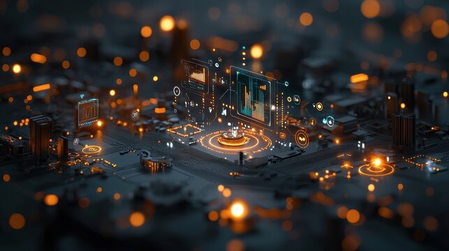 A futuristic control room displays digital screens with graphs and city views, emphasizing advanced technology and urban landscapes.