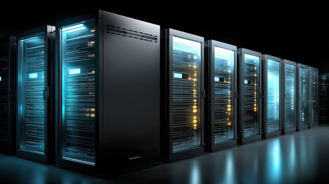 A futuristic server room with glowing data servers, showcasing advanced technology and digital connections in a dark environment.
