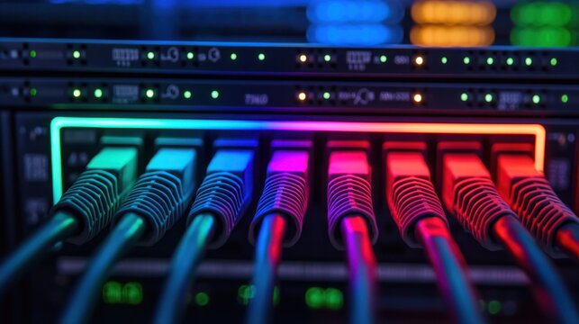 Super computer network cables glowing in data center dynamic technology environment close-up view