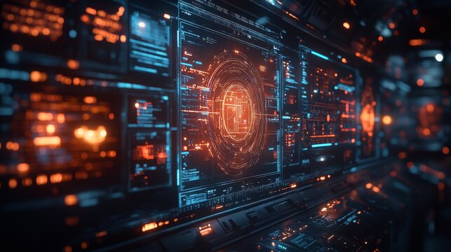 A high-tech digital interface with a dynamic glowing core, representing the fusion of technology and data in an advanced futuristic setting.