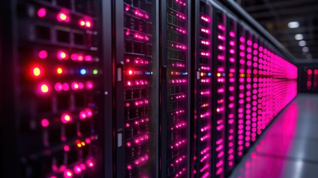 A brightly lit server room corridor with glowing server racks, showcasing advanced technology infrastructure and vibrant lighting effects, representing modern data management and IT systems.