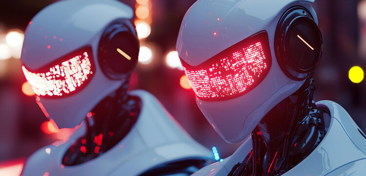 Futuristic robots with glowing LED faces, representing advanced technology and AI integration in a sleek, modern design for innovative concepts