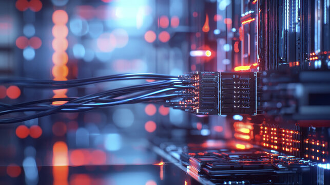 High tech server room with illuminated cables and circuit boards, showcasing advanced technology and data processing capabilities