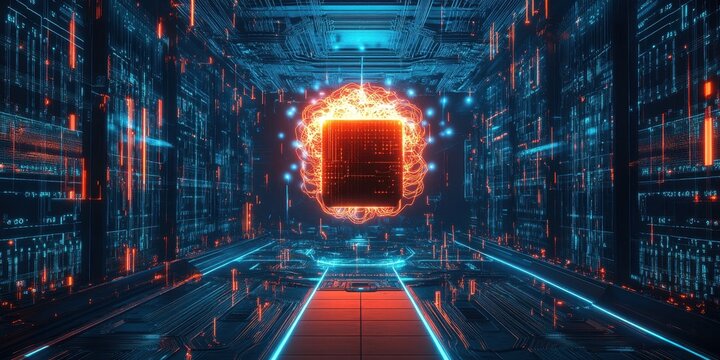 A vibrant digital space filled with glowing lines and circuits highlights a central floating cube. This high-tech environment showcases advanced data processing. Generative AI