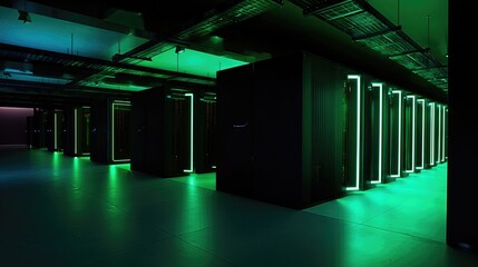 Futuristic green-lit server room with modern design