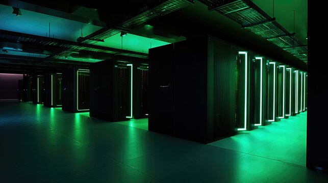 A high-tech data center bathed in cool green light. Illustrating the essence of advanced technology.